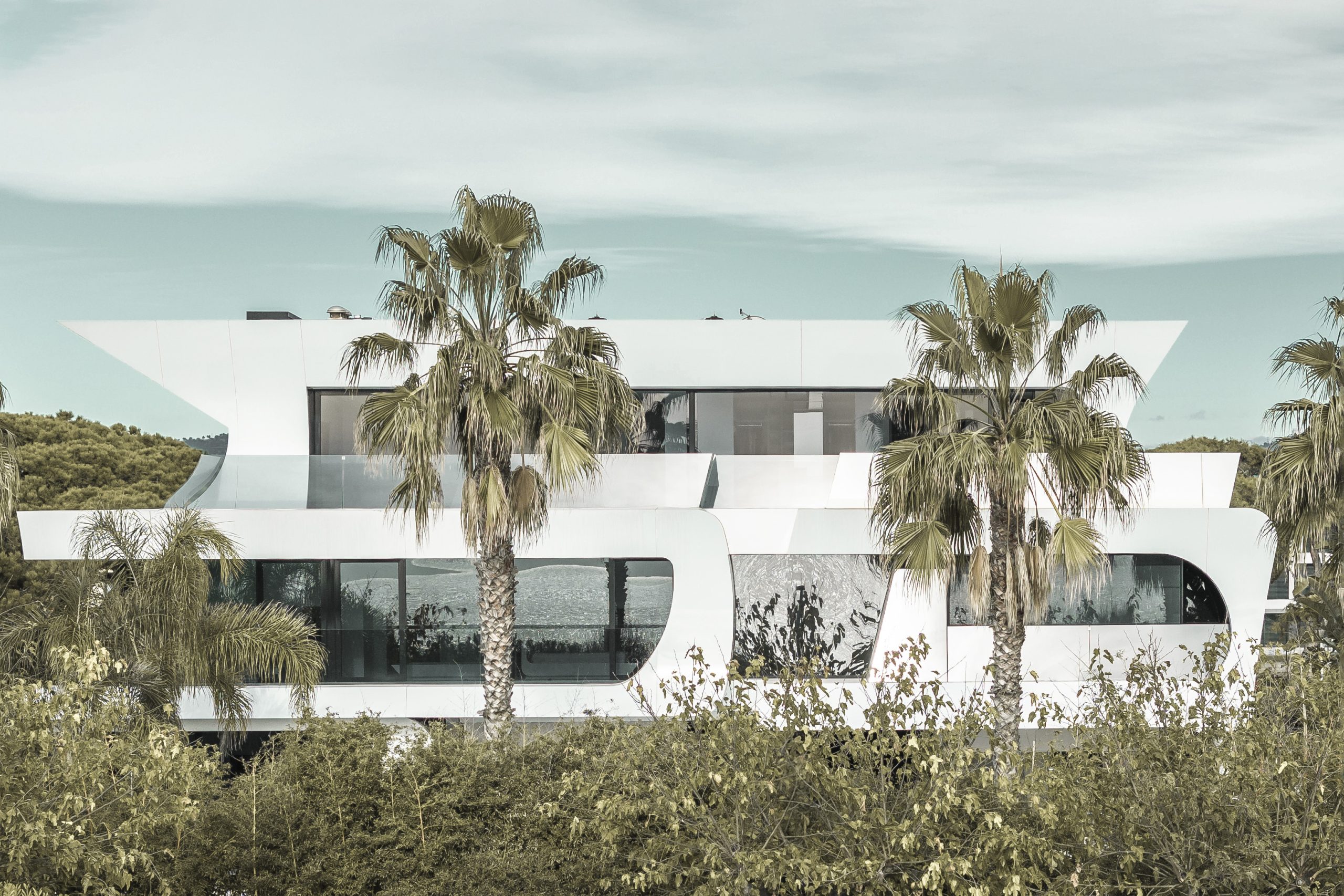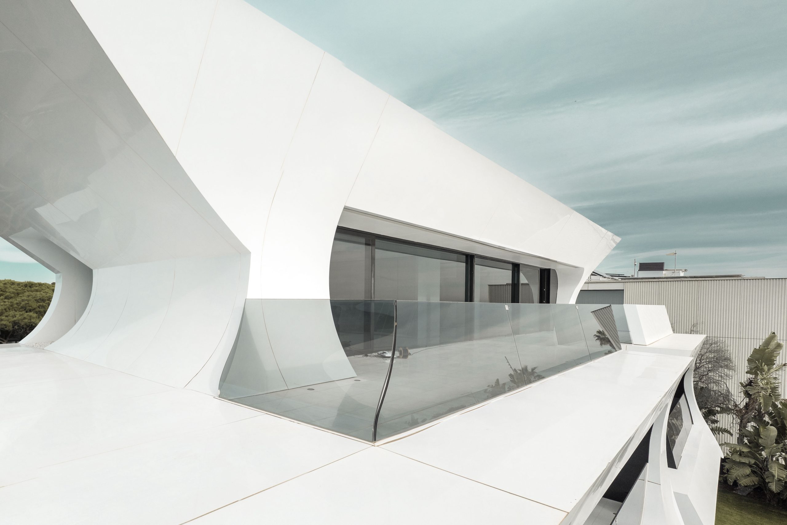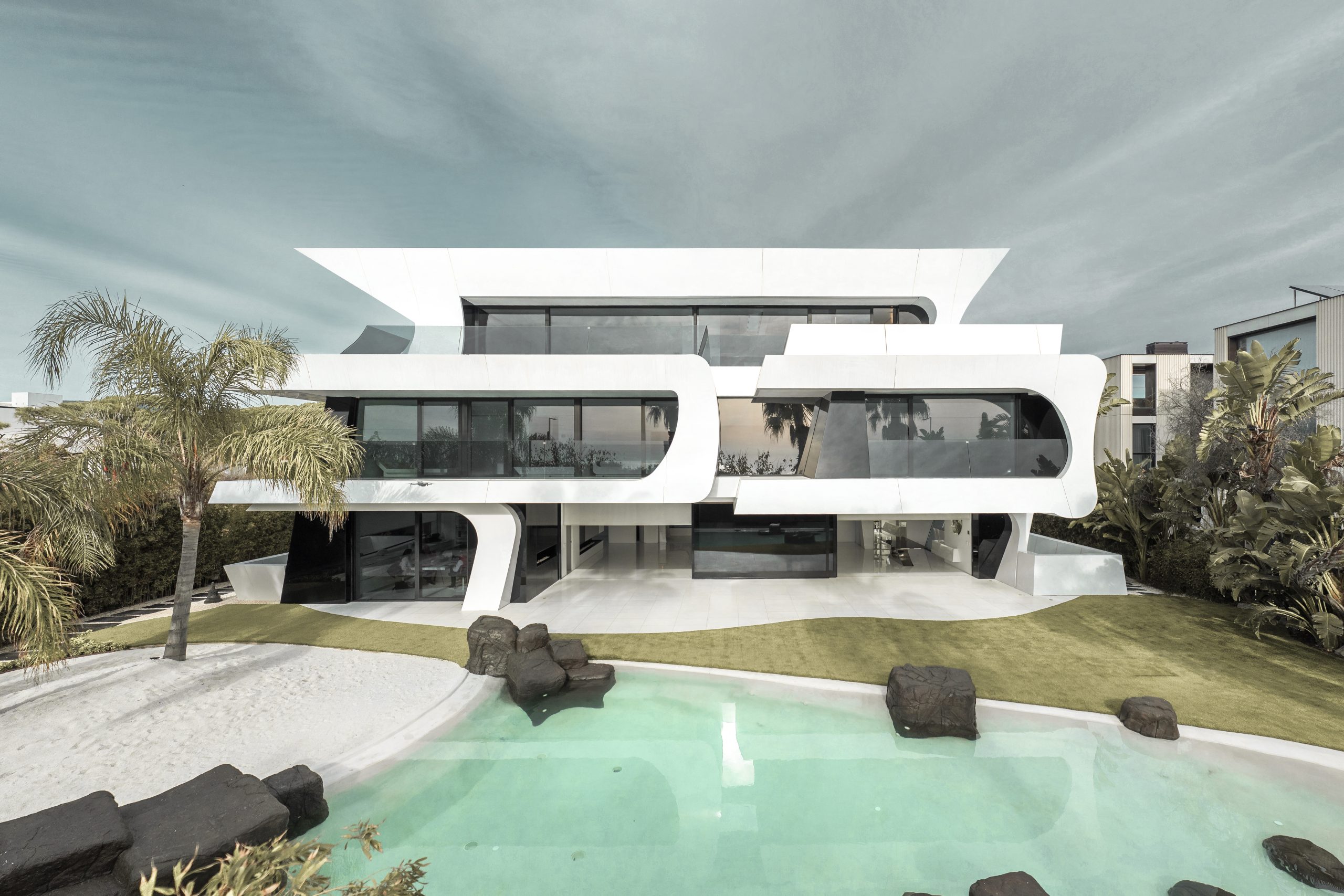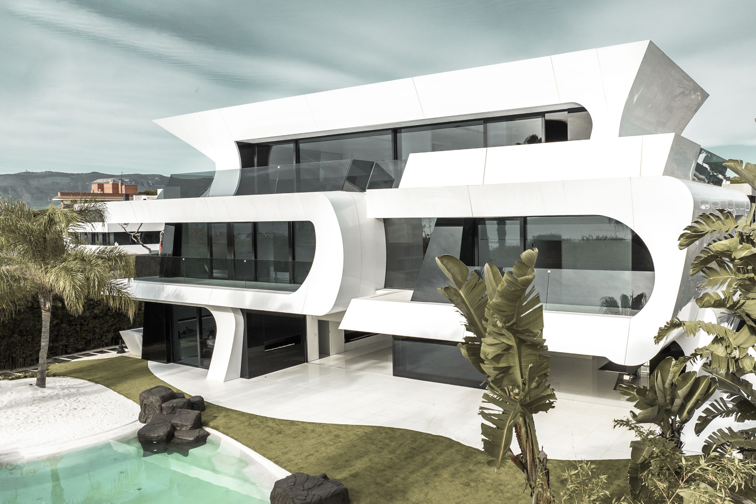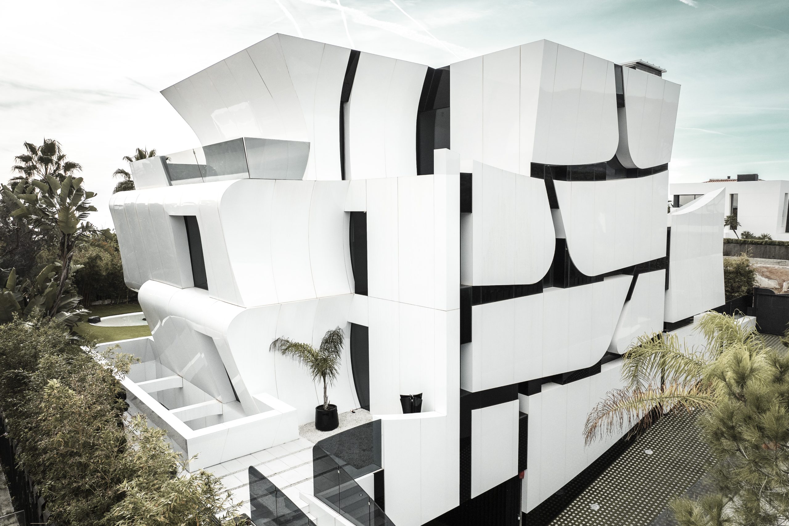 Esta singular vivienda ubicada en Gavá, en el bajo Llobregat en Barcelona, tiene 1450 m2 construidos. Con una imponente estética en blanco y negro, tiene una potencia visual como pocas y su carácter escultórico ha sido llevado a extremos, con un complejo despiece de fachadas y un desarrollo en 5 niveles donde el blanco es el protagonista.
